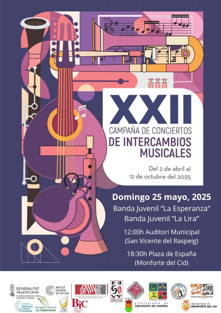 Desde el 2 de abril al 12 de octubre se celebra la XXII Campaña de Conciertos de Intercambios Musicales en nuestra provincia. Este próximo domingo 25 de mayo le toca el turno a nuestra Banda juvenil «La Esperanza», junto a la Banda «La Lira» de Monforte del Cid. Los coniertos se celebrarán a las 12:00h. en el Auditorio Municipal de San Vicente del Raspeig y a las 18:30h en la Plaza de España en Monforte del Cid.